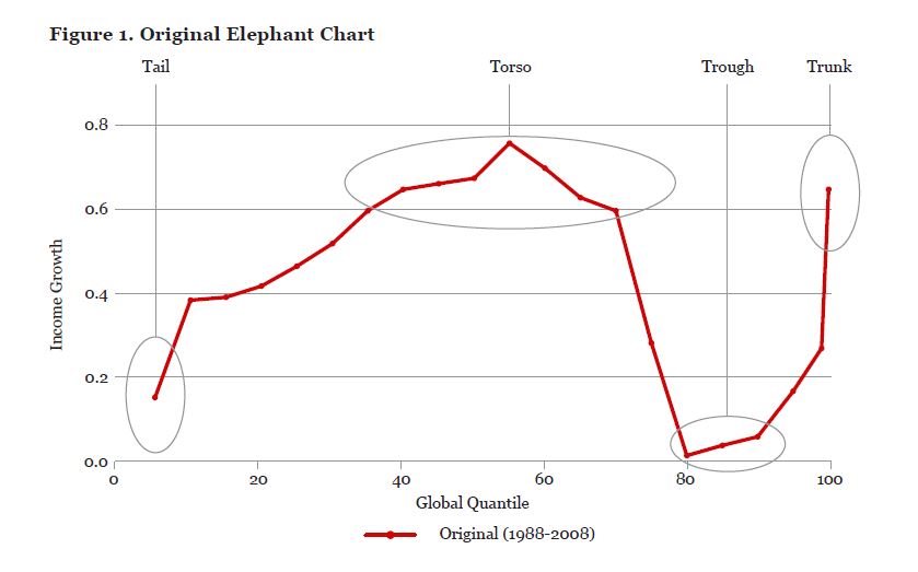 In questo senso, è necessario ricordare sicuramente lo studio magistrale per la World Bank del 2012, portato a termine dall’economista serbo Branko Milanović dopo anni di ricerca presso gli archivi di tutto il mondo. Il suo famoso grafico dalla “curva a proboscide” o a forma di elefante (dalla sagoma che assume la figura), presentata nel suo libro "Ingiustizia globale. Migrazioni, disuguaglianze e il futuro della classe media", ha consentito di guardare agli effetti della globalizzazione sulla disuguaglianza mondiale, permettendo di comprendere quali strati della popolazione hanno ricevuto i maggiori benefici.