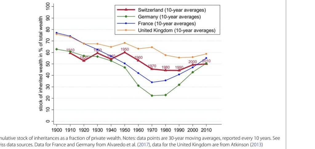 Allo stesso tempo tuttavia il tema della famiglia si lega a quello, ben più ampio, delle disuguaglianze, come accennavo all’inizio. Il grafico qui sotto riportato mostra l’andamento del capitale privato e il peso dell’eredità.